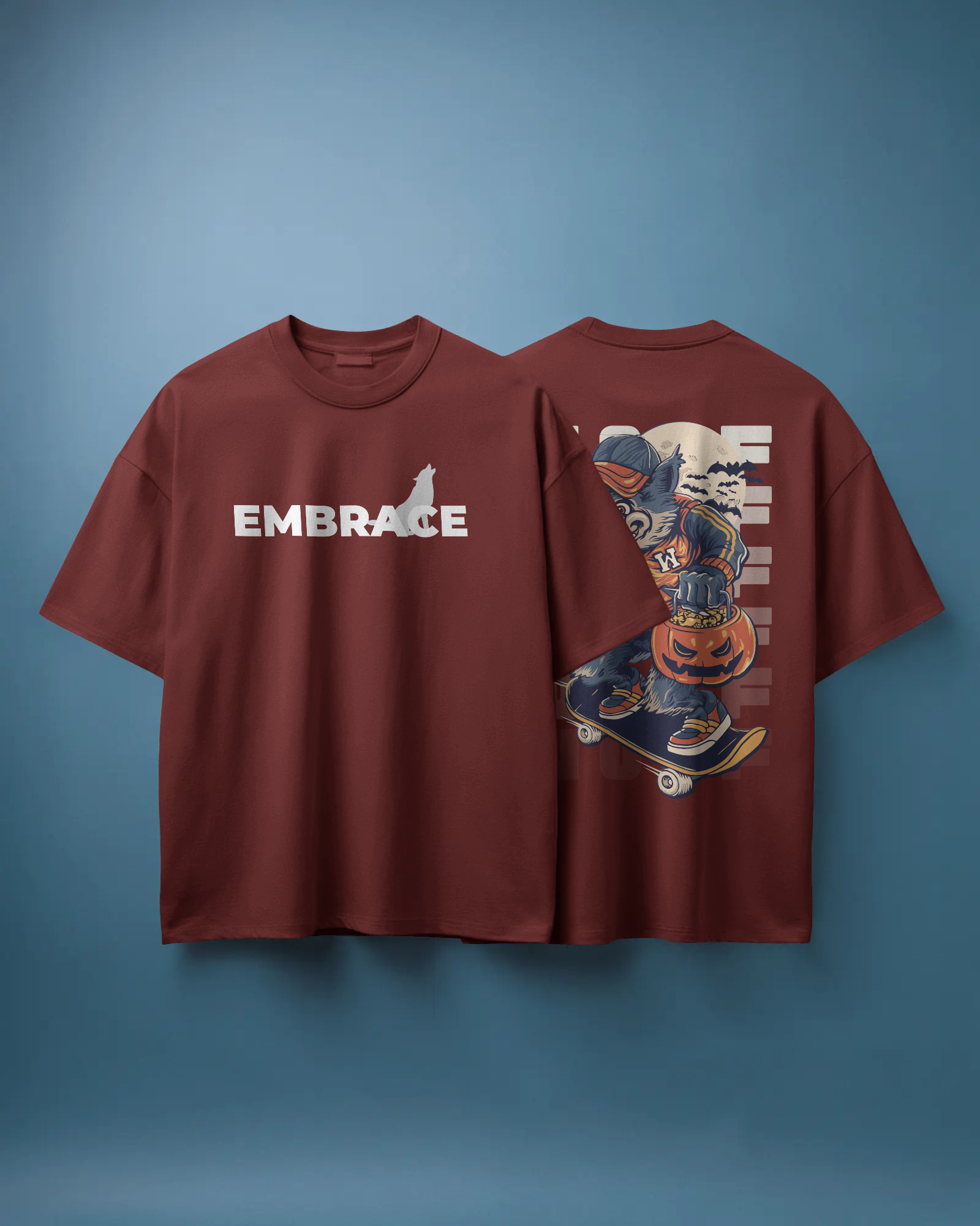 This oversized tee features a werewolf who doesn’t wait for Halloween — he rides into town on a skateboard, rocks a varsity jacket, and carries a pumpkin full of candy and zero regrets. Bats? Check. Sass? Double check. Street cred? Through the roof.